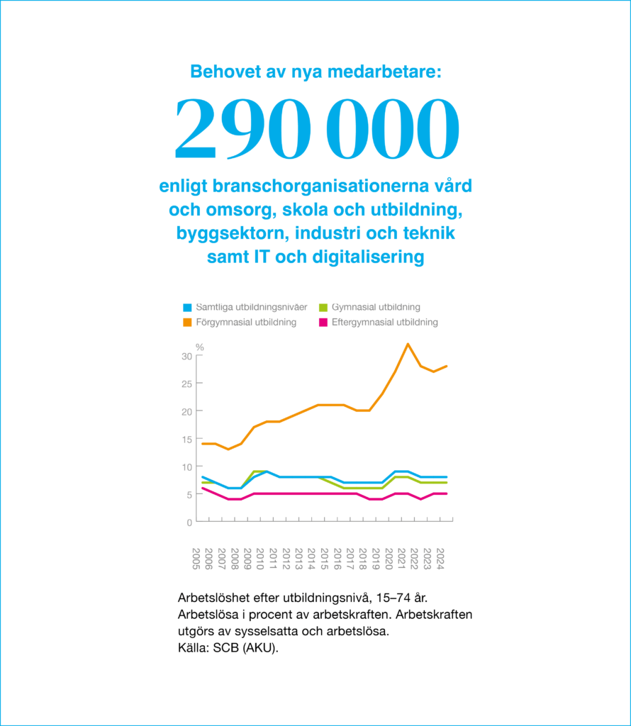 Om Sverige ska fortsätta vara ett ledande land inom innovation och ha en fungerande offentlig sektor behövs kvalificerad arbetskraft. Kairos Future har gjort en fördjupad studie som visar på ett omfattande kompetensbehov i flera branscher. Både näringslivet och offentliga sektorn brottas med samma utmaning – vem ska kunna göra jobbet när allt fler inte klarar skolan?
