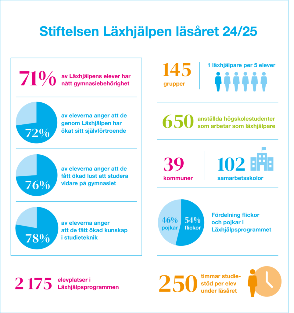 För att säkerställa att vårt stöd håller hög kvalitet gör vi kontinuerliga mätningar. Under läsåret 24/25 nådde 71% av eleverna i läxhjälpsprogrammen gymnasiebehörighet.